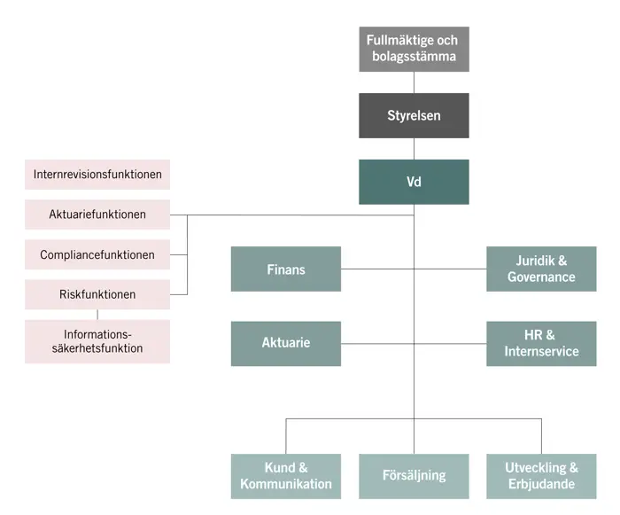 Aktuarie-, Compliance-, Internrevisions- Informationssäkerhets- och Riskhanteringsfunktionerna är fristående centrala funktioner. Alla rapporterar till styrelse och VD, förutom Internrevisionsfunktionen som endast rapporterar till styrelsen.